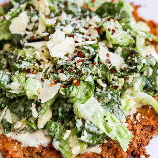 Once your crust is done, cooking, take out of the oven. Pour a light layer of the Caesar dressing on top of the chicken just like if you were to put sauce on a pizza. Then top it with your salad mix garnish with extra Parmesan and if you would like red pepper flakes serve and enjoy.